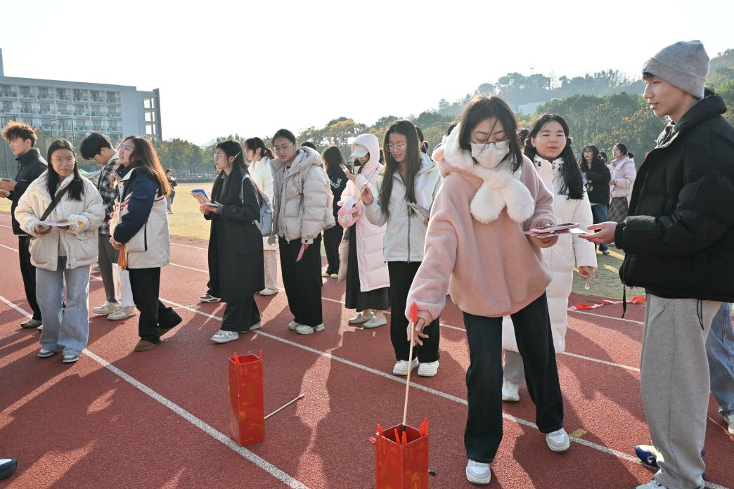 投壶区热闹非凡,同学们手持箭矢,全神贯注地瞄准壶口。在千年传统游戏的现代演绎中,每一次投掷都是与自我的对话——投中时,成就感如繁花般绽放,自信在欢呼中攀升;未中时,遗憾与不甘化作成长的注脚,教会大家坦然面对挫折。这一方小小投壶场,既是传统文化的传承地,更是心灵纳福的修行所,让同学们在一投一掷间,于娱乐中修身,于古韵中养心。