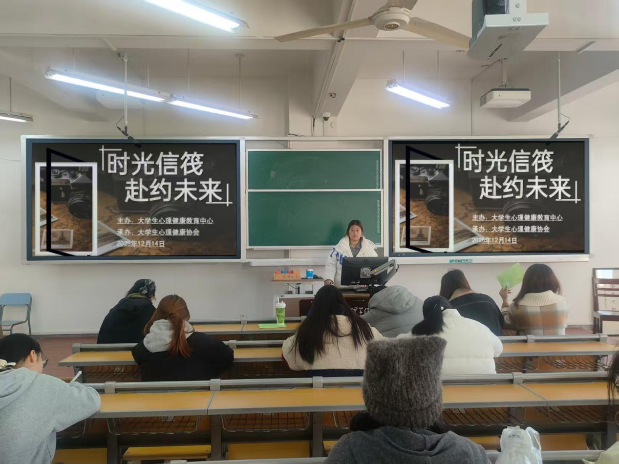 12月14日,由大学生心理健康教育中心主办、大学生心理健康协会承办的「时光信笺,赴约未来」活动,在洒满阳光的教室里正式开启。午后的阳光透过窗户,在课桌上投下斑驳的光影,像碎金一般落在红色的信笺格线上,也落在同学们执笔的指尖。投影仪上“时光信笺,赴约未来”的字样清晰明亮,主讲人温柔的话语,为这场与未来的约定拉开了序幕。